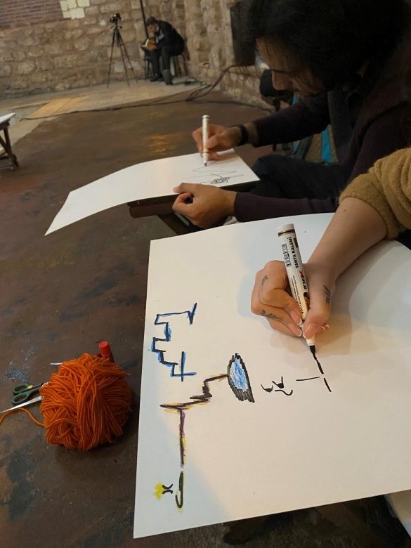 Engelsiz Eğitim Vakfı (ENEV) ve İstanbul Kent Üniversitesi bünyesinde kurulan İstanbul Kent Sanat, Atölye Pikolo iş birliği ile 5-9 Kasım tarihlerinde Atoui’nin çalışmasından ilham alarak “Çizgilerin Sesi ve Ritmi” isimli atölyesini gerçekleştirdi. Atölye kapsamında, İstanbul Kent Üniversitesi öğrencilerinin katılımıyla sesin oluşumu, algılanması ve görselleştirilmesinin yansımaları üzerine çalışmalar gerçekleştirildi. “Duyduğumuz sesleri çizebilir miyiz? Gözlerimizi kapattığımızda sesleri tam olarak nasıl hissediyoruz?” İşte, bu soruların cevapları bu etkinlikte saklıydı. Katılımcılar, 15. yüzyıldan kalma Küçük Mustafa Paşa Hamamı’nda “Fısıldayan Oyun Alanı”nın nesneleri ve kaplarını kullanarak duyuları aşan bu alanı bütün bedenleriyle dinlemeye davet edildi. Atölyenin üretim aşamasında ise katılımcılar, resmin ana öğelerinden biri olan çizgileri duyduklarını aktararak kendi soyut resimlerini yaratmak için kullandılar. Atölye sonucunda her bir katılımcı, duyusal algıları ile hissettiklerini somut hale getiren benzersiz eserler üretirken, kendi iç dünyalarını da kâğıda yansıtmış oldu.