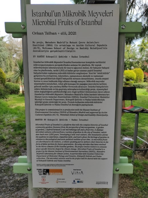Orkan Telhan ve elii (Bir IMNA projesi) tarafından üretilen İstanbul’un MikrobikMeyveleri, İstanbul bostanlarının karmaşık tarihlerini mikroorganizmaların perspektifinden anlatan bir platform. Bir toprak mikrobiyolojisi laboratuvarıyla bir meyve ağacının melezi, bir bahçeler bahçesi olan bu platformda, tarihi 1500 yıl kadar geriye uzanan çeşitli İstanbul bahçelerinden toplanmış mikrobik kültürler sergileniyor. Acción Cultural Española (AC/E), Weitzman School of Design ve Kadıköy Belediyesi’nin desteğiyle gerçekleşen proje, 30 Nisan’a kadar, Özgürlük Parkı’nda görülebilir.