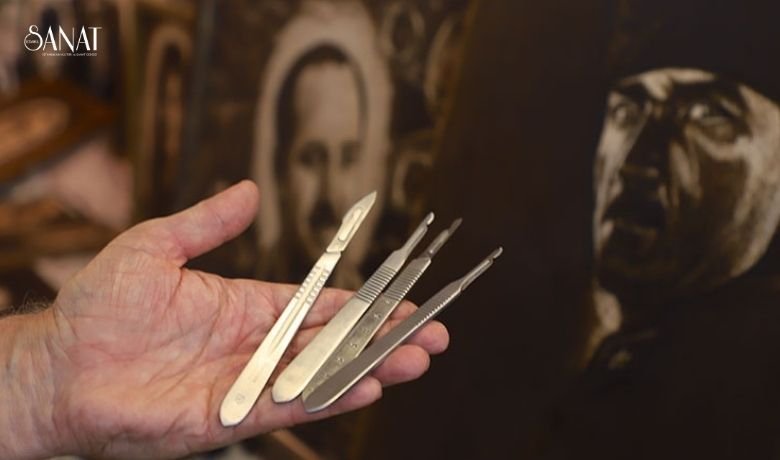 Azerbaycanlı amatör ressam Hüseyin Mirtegevi, neşter kullanarak resim yapıyor.