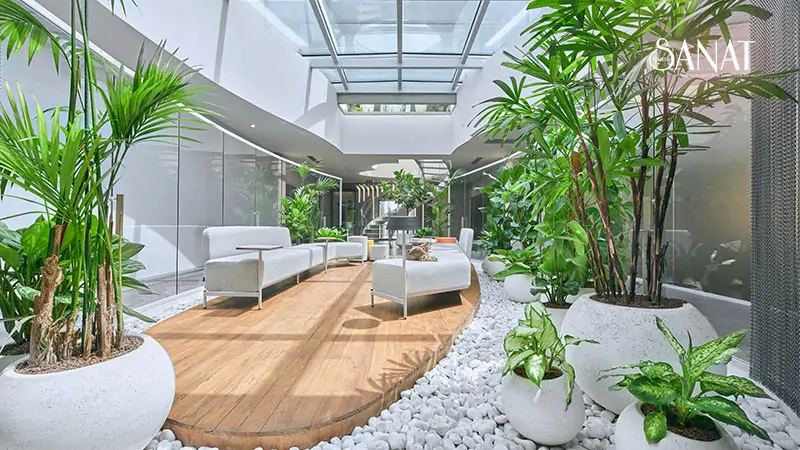 Açık ofis katları, şeffaf ve esnek bir çalışma ortamı sunmak üzere tasarlanarak, idari odalar dışındaki alanlarda platformlar ve geçirgen özel mobilyalar ile mekansal ayrımlar sağlandı. Her kat için belirlenen özgün renk konseptleri, ofislerin kendi karakterini öne çıkarırken, genel tasarım dilinin bütünlüğünü koruyor. Zemin ve bodrum katlar ise yüksek tavanlar, eğrisel tasarım öğeleri ve özel mobilyalar ile dinamik, çok amaçlı ortak alanlar olarak planlanıp; kafe-bistro, spor salonu, mini amfi, seminer alanı gibi işlevler; doğal ışık, biyofilik tasarım ve peyzaj entegrasyonu ile desteklendi. Böylece, Anadolu Ajansı İstanbul Genel Müdürlüğü’nde estetik, işlevsellik ve kullanıcı deneyimi bir arada sunuldu.