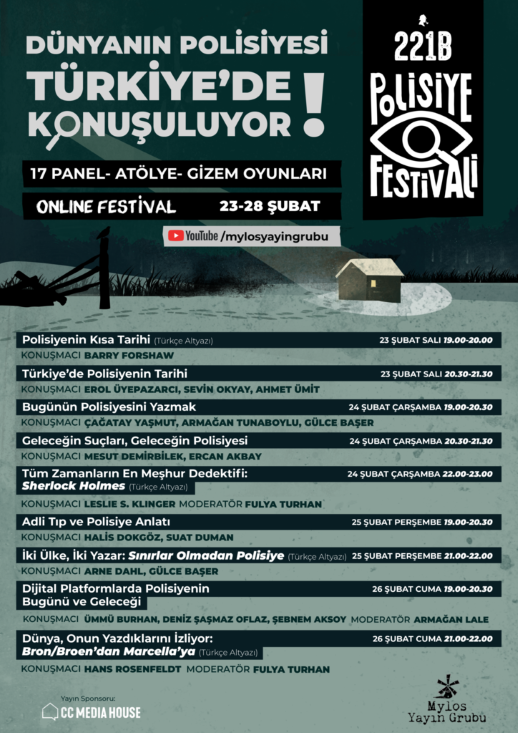 221B Polisiye Festivali, 23 – 28 Şubat 2021 tarihleri arasında, altı gün boyunca Mylos Yayın Grubu Youtube sayfasından izlenebilecek; festival, 17 farklı panel, atölye ve gizem çözme oyunlarıyla dünyanın polisiyesini tek festivalde buluşturuyor!