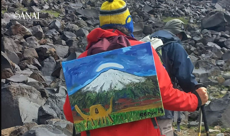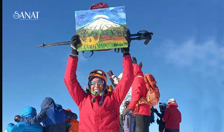 Çok zorlu ve sarp geçitlere sahip Ağrı Dağı’nın 5 bin 137 metrelik zirvesine, yaptığı kocaman tabloyu sırtına bağlayarak tırmandı ve bir ilki başardı.