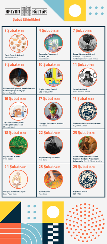 Kalyon Kültür, İstanbul’un kültür sanat birikimine katkı sunmak için 7’den 70’e geniş bir kitleye hitap eden sergileri, eğitim atölyeleri, kişisel gelişim seminerleri ile sanatın büyülü dünyasına kapı açıyor. Her ay yenilenen sanat dolu programları ile dikkat çeken Kalyon Kültür, Şubat ayında da İstanbulluların uğrak noktası olmayı hedefliyor.