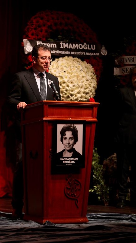 “Handan Uran Ertuğrul, kıymetli eşi Muhsin Ertuğrul’la yıllar sonra ebediyette buluşacak” diyen İmamoğlu, “Biz de bugün eşi Muhsin Ertuğrul’un adını taşıyan bu özel tiyatro salonunda bir araya geldik. Türkiye’nin en önemli sanatçılarından biri, çağdaş tiyatromuzun kurucularından olan eşinin adını taşıyan bir sahneden son yolculuğuna uğurlanıyor. Bunun çok anlamlı olduğunu düşünüyorum. Handan Ertuğrul’a bir kez daha Allah’tan rahmet, yakınlarına ve sahne dünyamıza başsağlığı diliyorum. Bu vesileyle Muhsin Ertuğrul’u da bir kez daha rahmetle anıyorum” şeklinde konuştu.