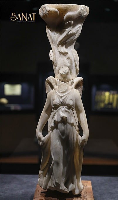Müzenin hazine odasında Nike’yi tasvir eden üç ayrı eser yer aldı. Helenistik Dönem’e tarihlenen 49 santim boyundaki mermer sütun, serginin en önemli parçası olarak gösterildi. İzmir’in Bergama ilçesindeki Pergamon Antik Kenti’nden 1925 yılında çıkarılan eserde, defne yaprağı motifleriyle süslü ve kanatlı Nike figürü elleriyle eteklerini tutuyor.