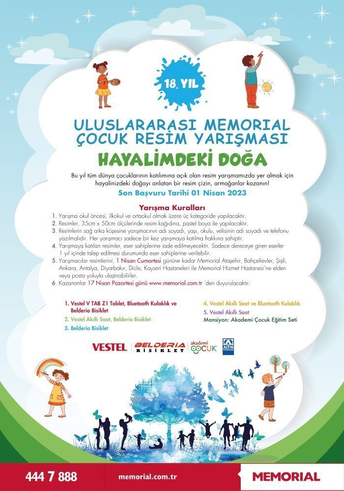 Memorial Sağlık Grubu, 18 yıldır Türkiye’nin dört bir yanından çocuğa ulaştığı resim yarışmasını bu yıl uluslararası boyuta taşıdı. Tüm dünya çocuklarının katılımına açık olan Memorial Uluslararası Çocuk Resim Yarışması ‘nın konusu ise “Hayalimdeki Doğa” olarak belirlendi.