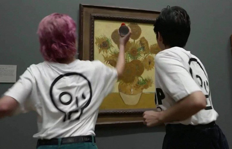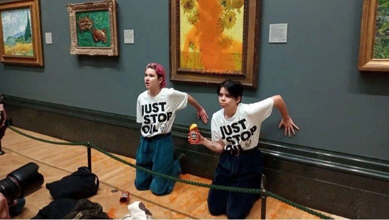 İngiltere’de Just Stop Oil (Sadece Petrolü Durdurun) adlı çevreci grubun iki üyesi, başkent Londra’daki National Gallery’de sergilenen Vincent Van Gogh’un “Ayçiçekleri” tablosuna, iklim değişikliğine dikkati çekmek amacıyla domates çorbası attı.