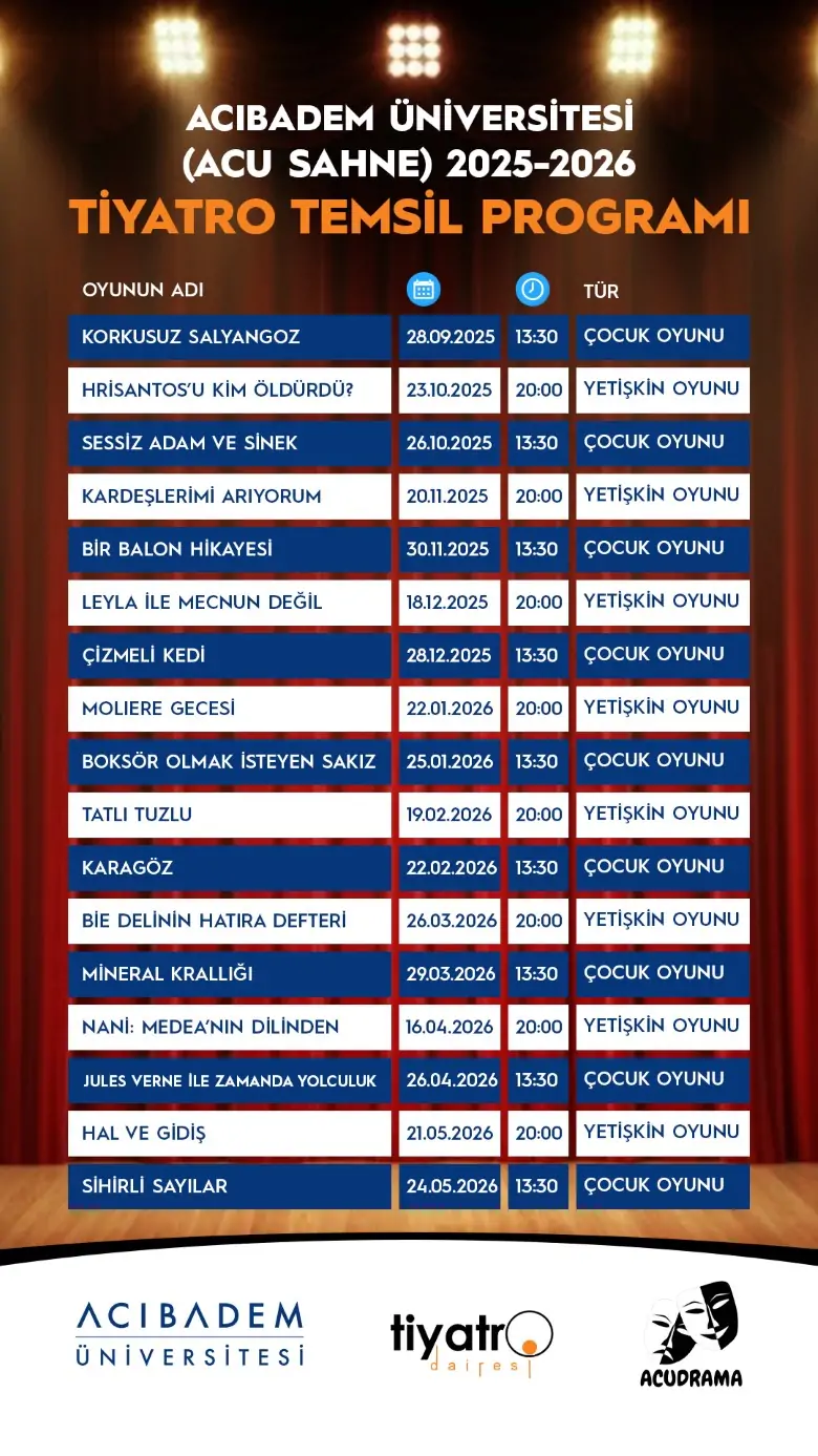 Acıbadem Üniversitesi Drama Kulübü ve Tiyatro Dairesi iş birliğiyle yürütülen “Perde Kampüste Açılıyor” projesinin 2025-2026 akademik yılı sezon oyunları belli oldu. Her ay bir yetişkin ve bir erişkin oyununun sahneleneceği oyunlar, dünya klasiklerinden örnekleri sahneye taşıyor.