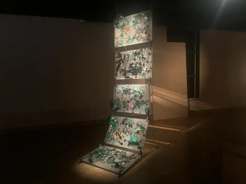 Serginin geniş bir alanı farklı dinamikleriyle birlikte düşündüğünü sözlerine ekleyen Özkara, sözlerine şöyle devam etti: “Sömürgeci bir iç deniz projesinin Sahra’daki tortuları, telekomünikasyon ağlarının görünmez peyzajı, terk edilmiş bir gece kulübünden sızan ışıklar ve yüzyılların çöküşünü saniyelere sığdıran obrukların sesi, mekanda birbirine karışır. Eski bir istihbaratçının Batı Asya’nın enerji haritasını belirleyen çöl rotalarından, nükleer felaketlerin arazide bıraktığı izlere, Avrupa’ya göçen işçilerin belleklerinde taşıdıkları manzaralardan, yok edilen Filistin köylerinin sınırlarını yeniden çizen inatçı kaktüs köklerine kadar nice anlatı, müşterek bir zeminde buluşur.”
