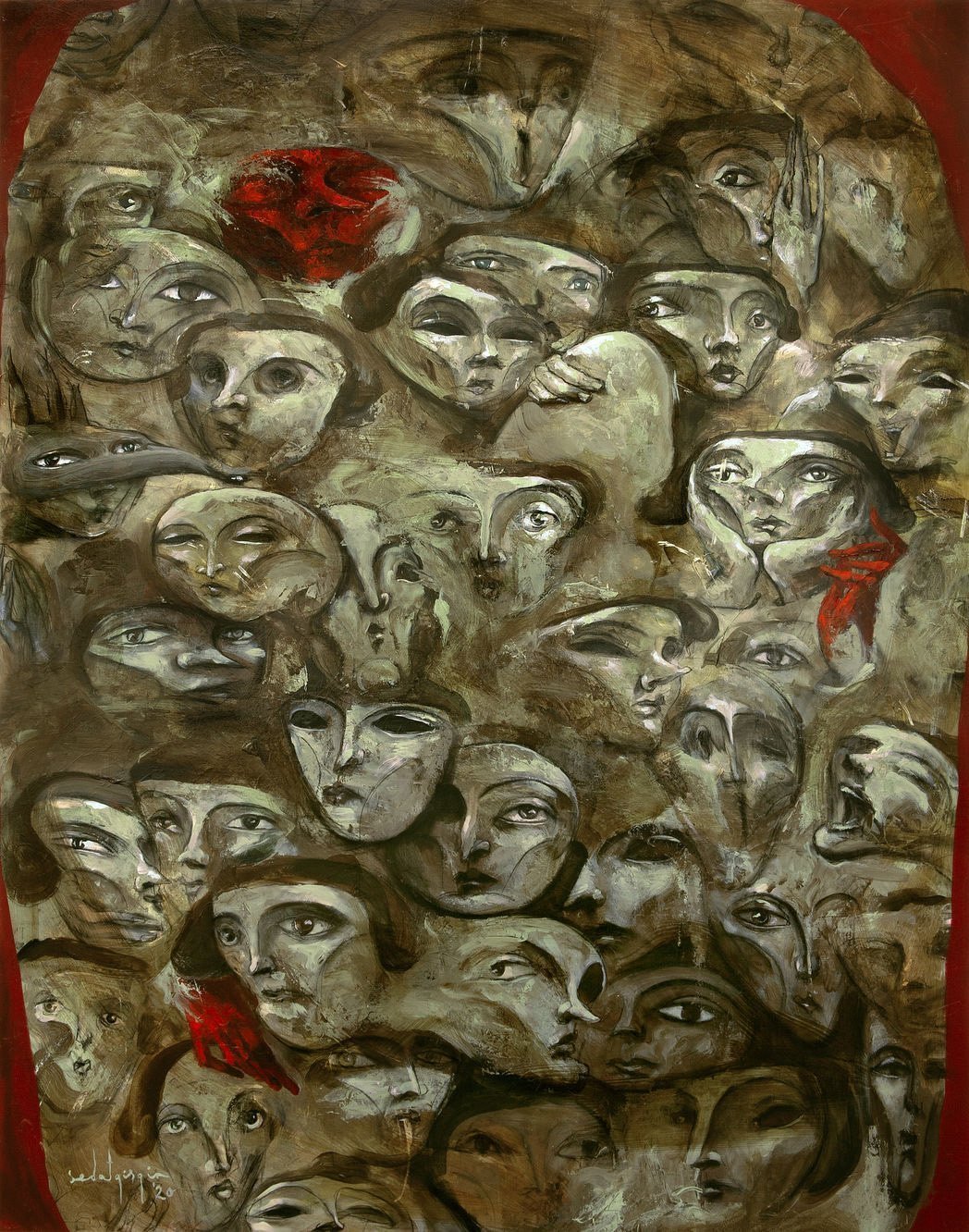 Kâğıt işlerin yer aldığı ikinci bölümde ise bizleri sanatçının daha sakin ve yalın kompozisyonları karşılıyor. Ağırlıklı olarak küçük boyutlu portrelerden oluşan ve bizlere bir nevi sosyal medya profil fotoğraflarını hatırlatan bu resimler kişinin kendini beğendirme ve çevresi tarafından görülme sevdası uğruna yalnızlaşarak kendine dahi yabancılaşması ve içine kapanması gibi kavramlar üzerine yoğunlaşıyor. Bu portrelerde teknik açıdan en dikkat çekici özellik farklı renkteki yoğun akrilik boyaların birbirlerine tam karıştırılmadan kullanılmasıyla oluşan renk zenginlikleri. Aynı insan duygularındaki anlık değişimler gibi…