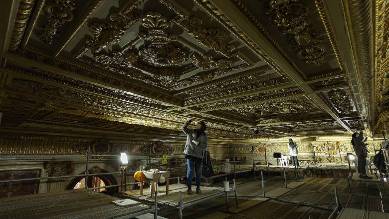 Osmanlı Devleti’nde yabancı devlet adamı ve elçilerin kabul edildiği, Türkiye Cumhuriyeti’nin kurucusu Mustafa Kemal Atatürk’ün Cumhurbaşkanlığı döneminde önemli etkinliklere ev sahipliği yapan Süfera Salonu’nda titiz bir restorasyon çalışması yürütülüyor.