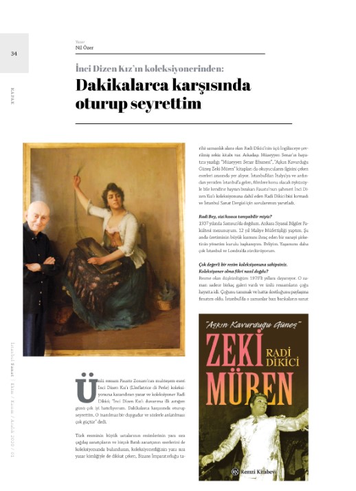 Türk resim sanatının büyük ustalarının eserlerinin yanında, çağdaş sanatçıların ve birçok batılı sanatçının eserlerini de koleksiyonunda bulunduran, koleksiyonerliğinin yanı sıra yazar kimliğiyle dikkat çeken, Bizans İmparatorluğu üzerine uzman olan ünlü yazar ve koleksiyoner Radi Dikici’ son röportajını İstanbul Sanat Dergisi’ne verdi. ‘İnci Dizen Kız’ tablosunu kapağına taşıyan, geçtiğimiz ay ilk sayısıyla okurlarıyla buluşan ‘İstanbul Sanat Dergisi’ için sorularımızı yanıtlayan ünlü tarihçi “İnci Dizen Kız’ı duvarıma ilk astığım günü çok iyi hatırlıyorum. Dakikalarca karşısında oturup seyrettim.” ifadesini kullanmıştı.