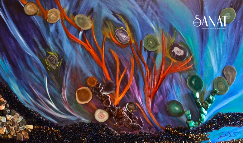 Bu yağlıboya eser, 1.20 metre yüksekliğinde ve 2.20 metre genişliğinde, yarı değerli taşlar ve çelik talaşının tuvalde sentezlenmesi ile ortaya çıktı. Çelik talaşıyla sentezlenen yarı değerli taşlar, su kontrasıyla birleşen eser, üç boyutlu bir hayal dünyasının kapılarını açıyor. Sanatçı, mavi opal, agat, ametist, malahit, obsidyen, kobalt kalsit gibi renkli taşlar kullanarak esere çok boyutluluk katarak, zenginlik kazandırmış. Tülin Kaynak bu çalışmasını adeta bir mücevher tasarımı inceliğinde, tamamen doğal taşların ve renklerin ilhamı ile tamamladığını ifade ediyor.