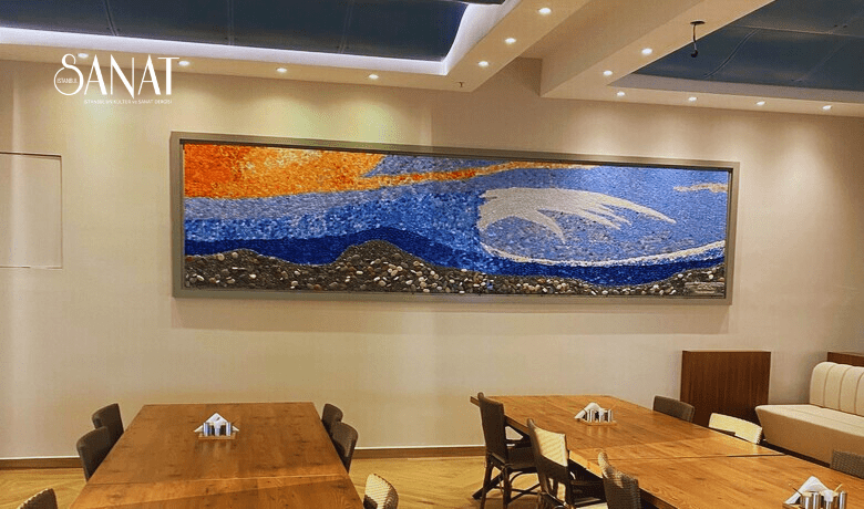 Bu mozaik eser, seçkin bir şirketin konuklarını ağırladığı salonun duvarında tabiattan esintiler sunacak.